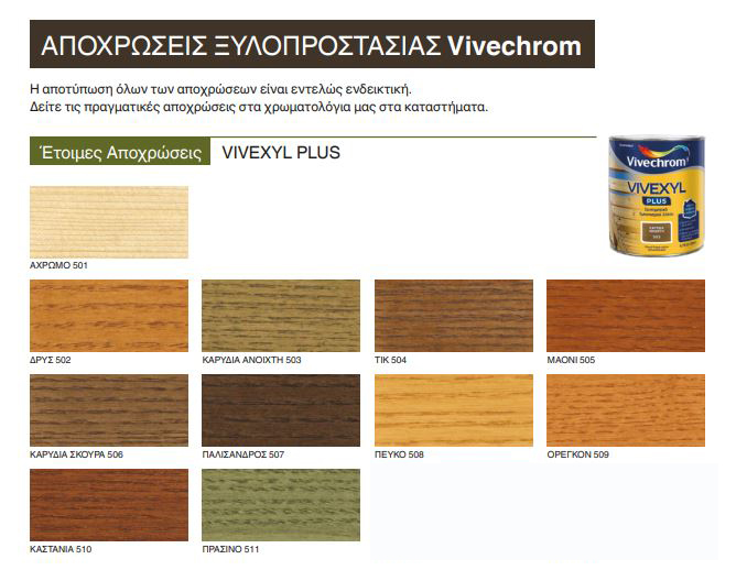 - Το VIVEXYL PLUS είναι έγχρωμο συντηρητικό εμποτισμού ξύλου εξωτερικής χρήσης που διεισδύει στο ξύλο, το εμποτίζει εύκολα και σε βάθος και το προστατεύει από τους μύκητες / μπλε κηλίδες.